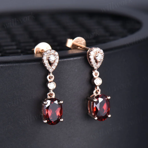 The Vintage Oval Garnet Earrings from WillWork Jewelry are a stunning and timeless accessory, perfect for adding a touch of elegance to any outfit. It is crafted from solid 14K rose gold. These earrings feature an oval-cut natural red garnet at their center, surrounded by sparkling diamonds.