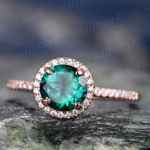 The Green Emerald Engagement Ring from WillWork Jewelry is a captivating piece that combines timeless elegance with a touch of vintage charm. This ring features a 7mm round-cut lab-treated emerald as its centerpiece, surrounded by natural, conflict-free diamonds.