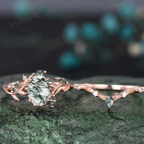 This enchanting engagement ring set from WillWork Jewelry is a tribute to nature`s beauty. The women`s ring is known for its unique green patterns. The stone is delicately cradled by beautiful details, adding an organic touch to the design. Sparkling adds further enhancement to the ring`s elegance.
